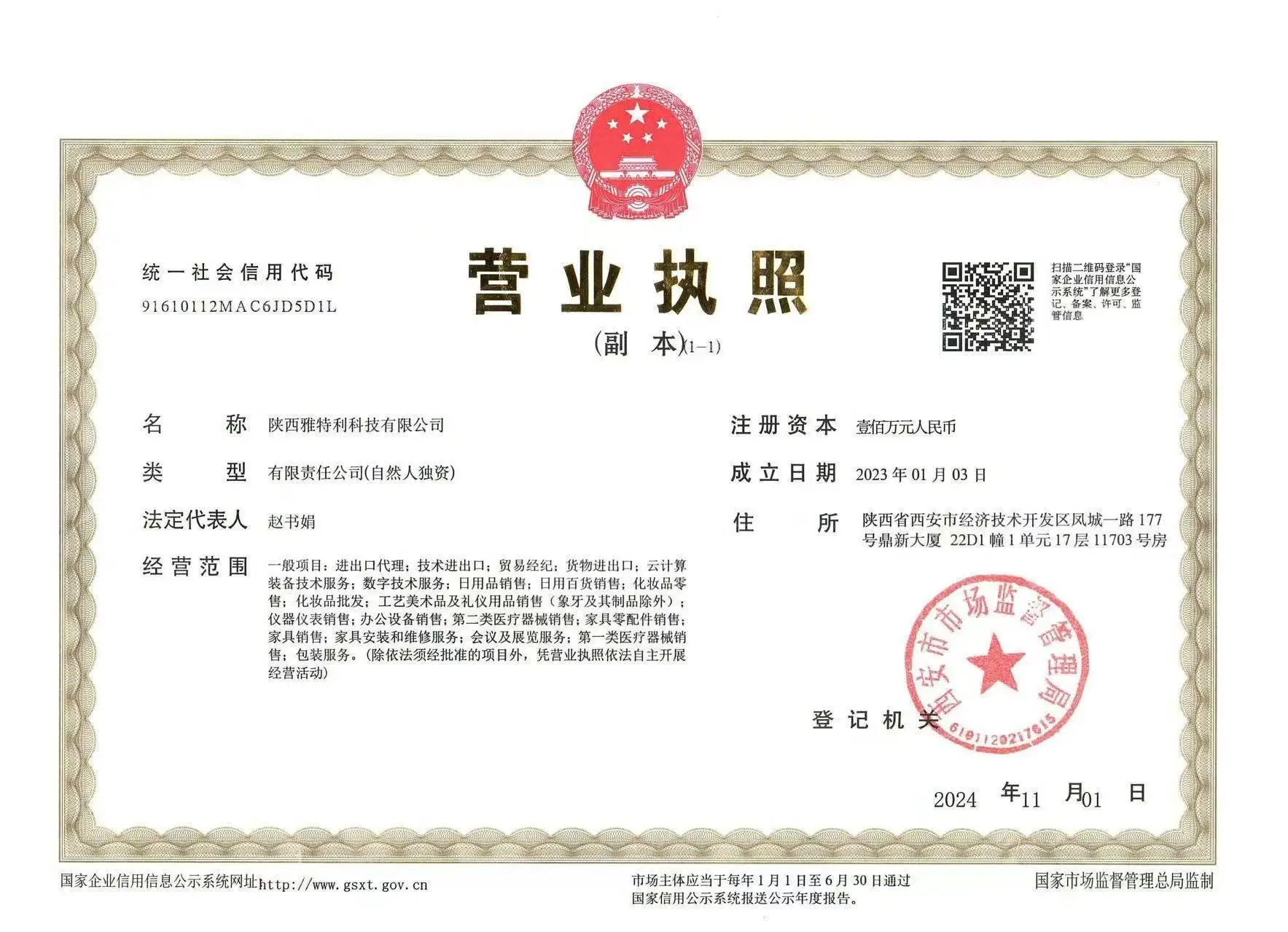 Registered address : Room 11703, 17th Floor, Unit 1, Building 22d1, Dingxin Building, No. 177 Fengcheng 1st Road, Xi'an Economic And Technological Development Zone Xi'an Shaanxi China